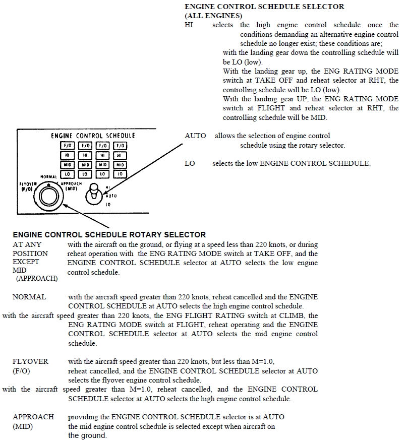 This small panel includes warning captions, engine control schedule, secondary air door control, fuel heaters, engine 4 N1 limit, engine recirculation valves